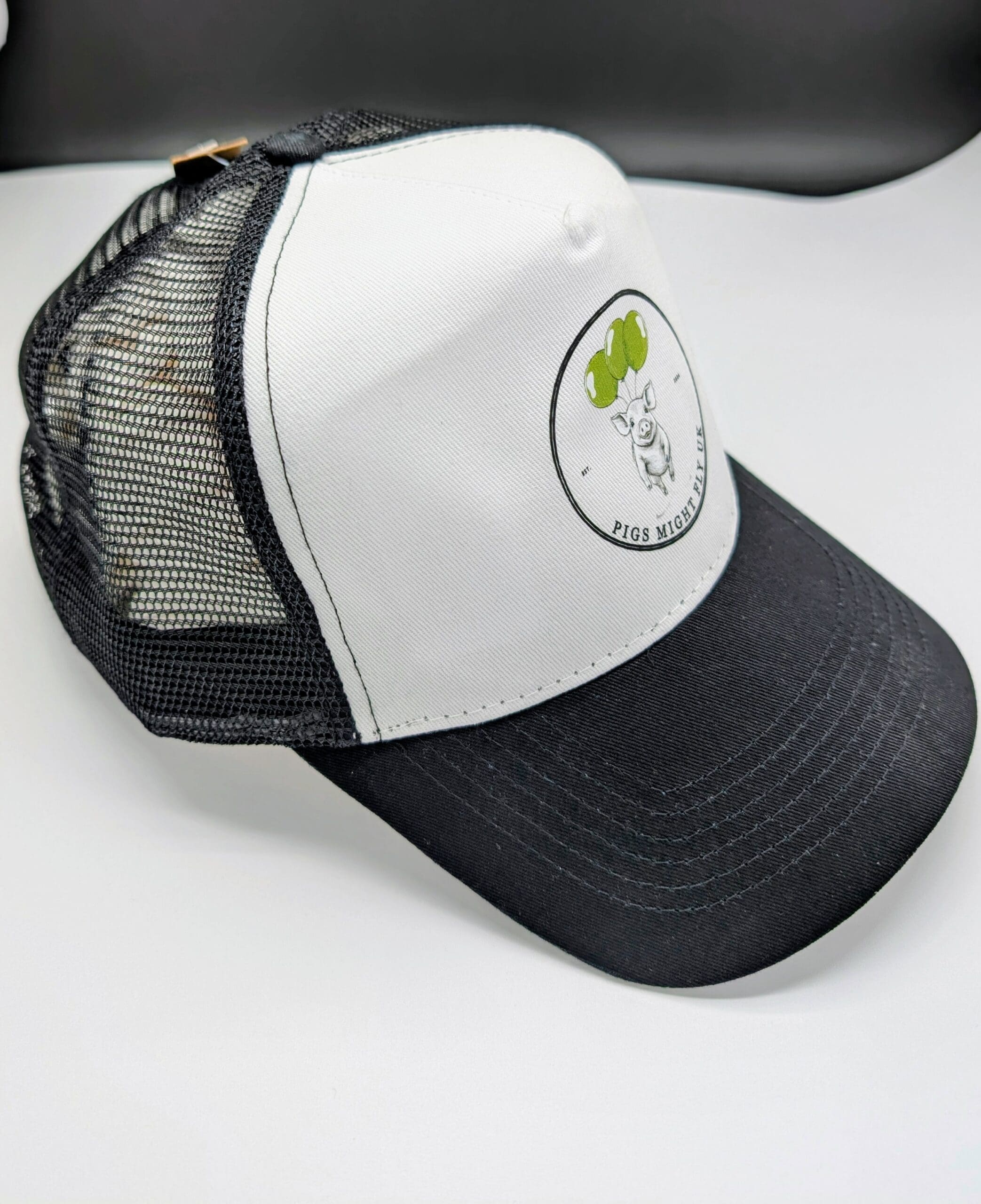 A classic black and white trucker cap featuring the Pigs Might Fly UK logo on the front panel. Lightweight, breathable, and easy to wear, this cap is perfect for everyday casual style.