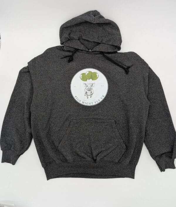 This premium hoodie features the signature Pigs Might Fly UK logo printed on the front — a playful pig lifted by green balloons, giving it a bold and distinctive look.