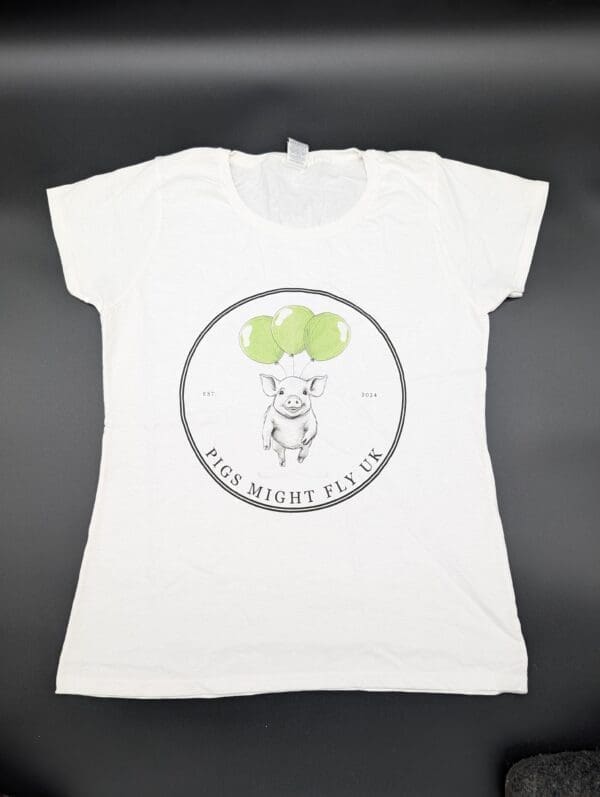 A clean white T-shirt featuring the signature Pigs Might Fly UK pig and balloon logo. Comfortable, lightweight, and perfect for everyday wear.